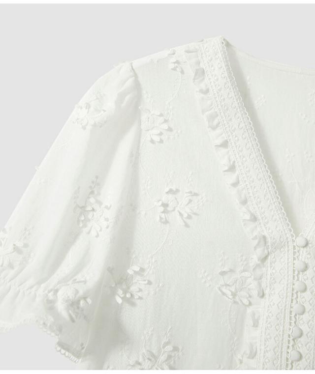 上品な白刺繍レースブラウス レディース 100%綿 半袖Tシャツ 夏 春 フリル袖 オフィスカジュアル 大人かわいい ビーチリゾートや日常使いにも S〜XL対応