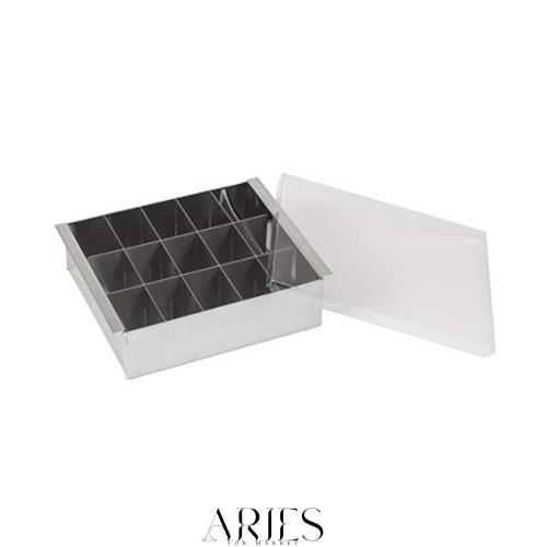 フルーツ寒天やゼリーなどを作るのに便利な仕切り付きの流し缶。 仕切りの組み合わせ方で9~15分割可能。 保存や持ち運びに便利なカバー付き。 熱に強いステンレス製だから蒸し物にも。玉子豆腐も作れます。(箱裏に作り方レシピ付き。カバーは外してください)。