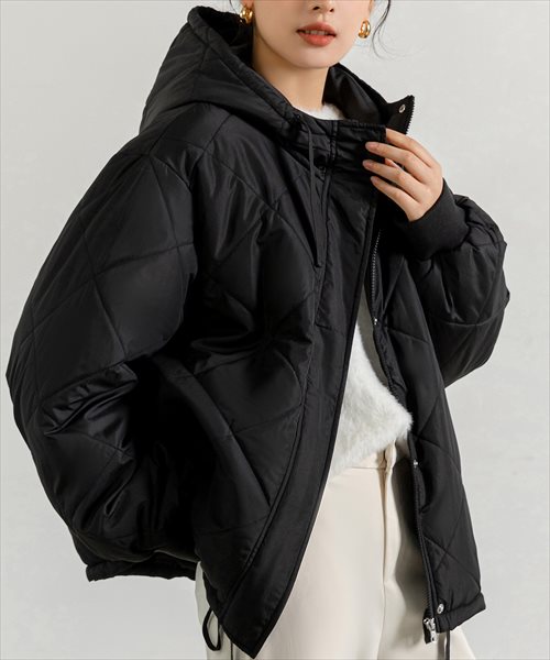 レディース もちっと見える袖まわり。メンズライクフード付きキルティングジャケット
