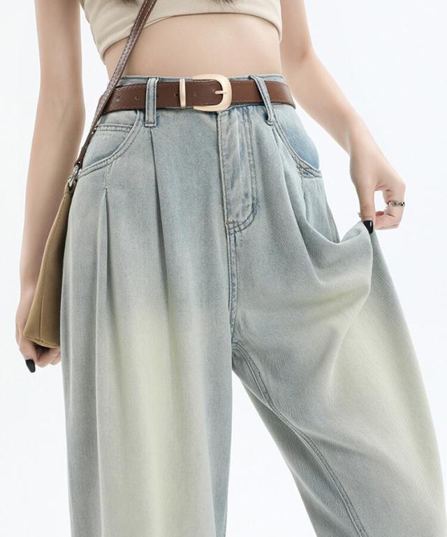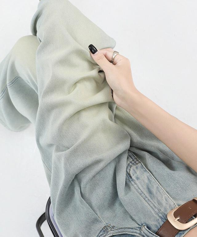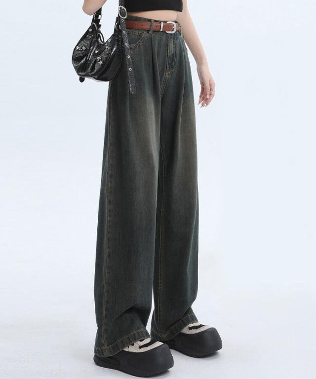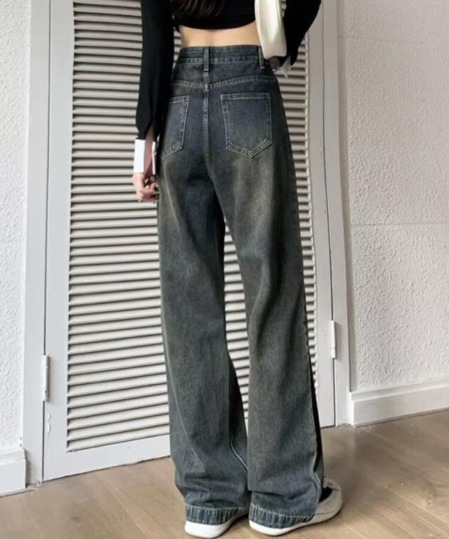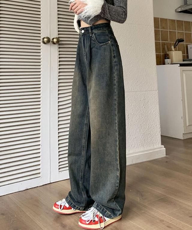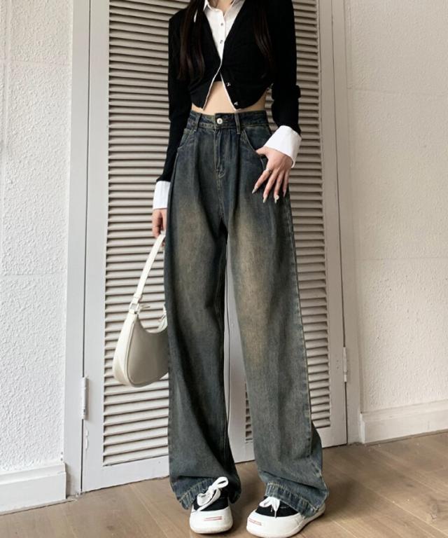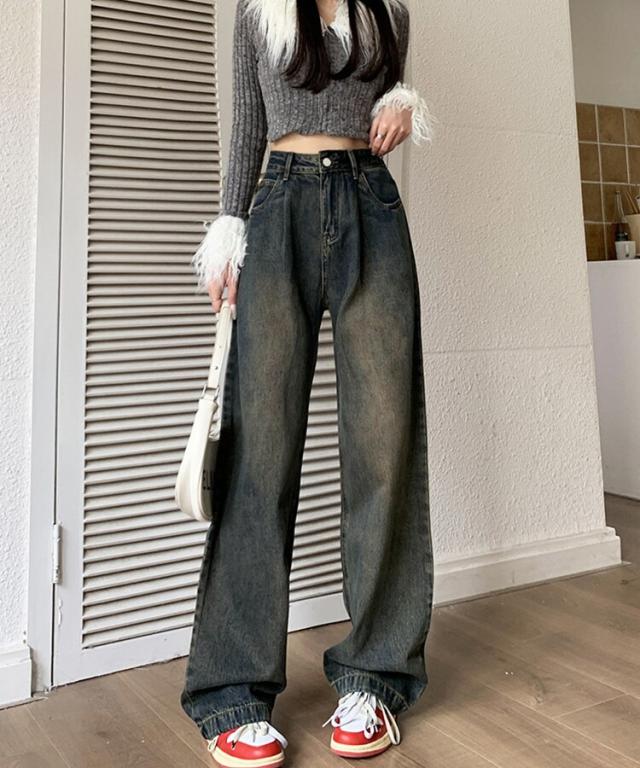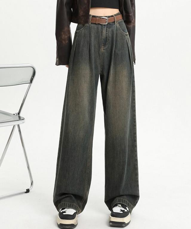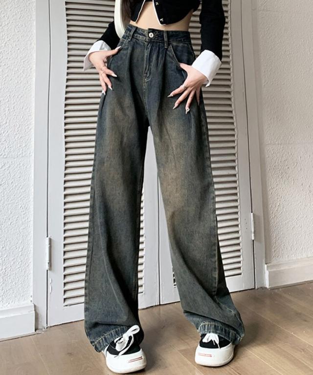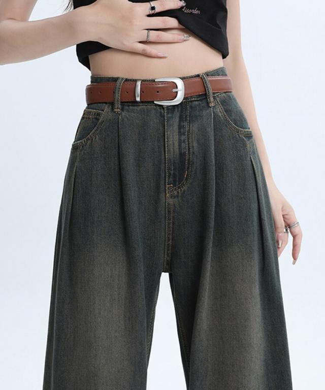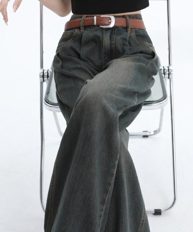 ハイウエストウォッシュ加工ワイドデニム