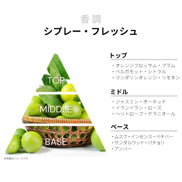 オレンジ・ブロッサム、プラム、ベルガモット、マンダリン・オレンジ、リモネン、シトラルなどが、シアーなシトラス・フローラルを香り立たせるトップから、