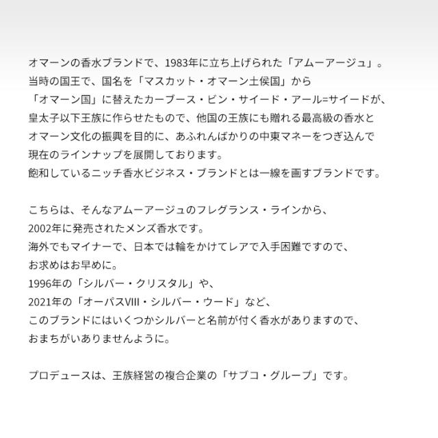 当時の国王で、国名を「マスカット・オマーン土侯国」から「オマーン国」に替えたカーブース・ビン・サイード・アール=サイードが、皇太子以下王族に作らせたもので、他国の王族にも贈れる最高級の香水とオマーン文化の振興を目的に、あふれんばかりの中東マネーをつぎ込んで現在のラインナップを展開しております。飽和しているニッチ香水ビジネス・ブランドとは一線を画すブランドです。