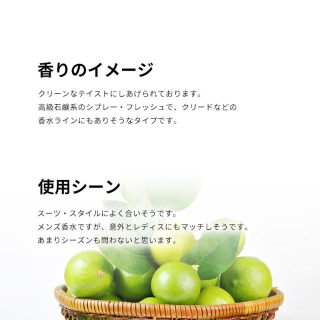 高級石鹸系のシプレー・フレッシュで、クリードなどの香水ラインにもありそうなタイプです。このタイプの中ではとても濃くてロングラスティングなところがポイント。スーツ・スタイルによく合いそうです。メンズ香水ですが、意外とレディスにもマッチしそうです。あまりシーズンも問わないと思います。