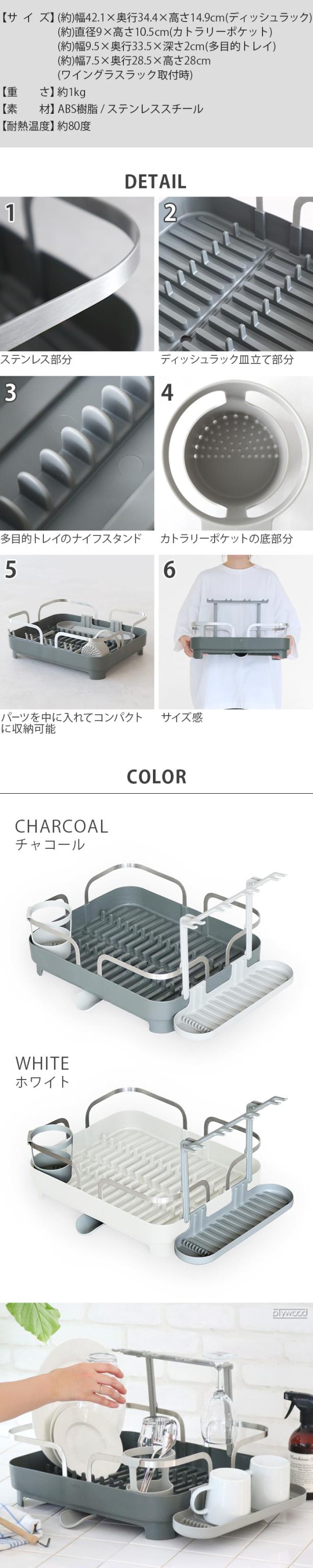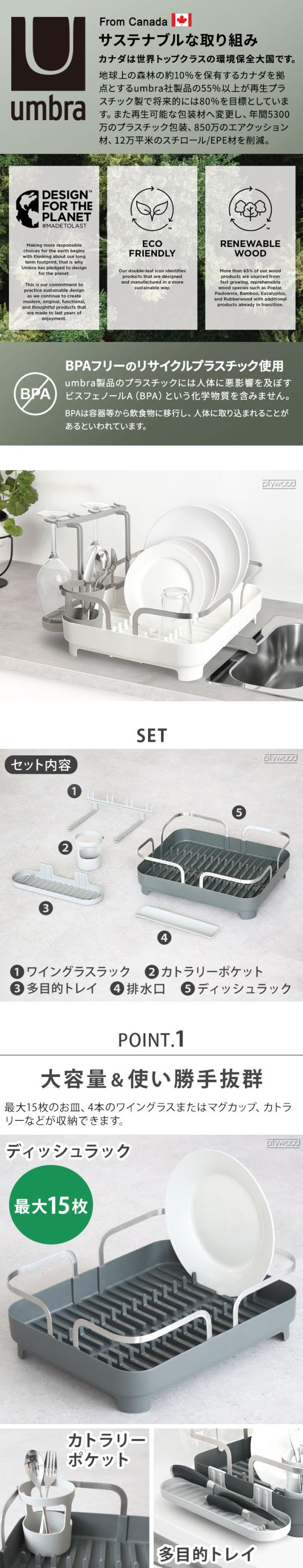 カナダ発ブランド「umbra」より、収納力抜群の大容量水切りかごのご紹介です。最大15枚のお皿、4本のワイングラスまたはマグカップ、カトラリーなどが収納できます。各収納パーツは着脱が可能。ラックの4辺のどこにでも配置できるので、キッチンスペースに合わせて自分でカスタマイズが可能。全パーツ食洗機で洗浄可能で、防錆加工も施されています。
