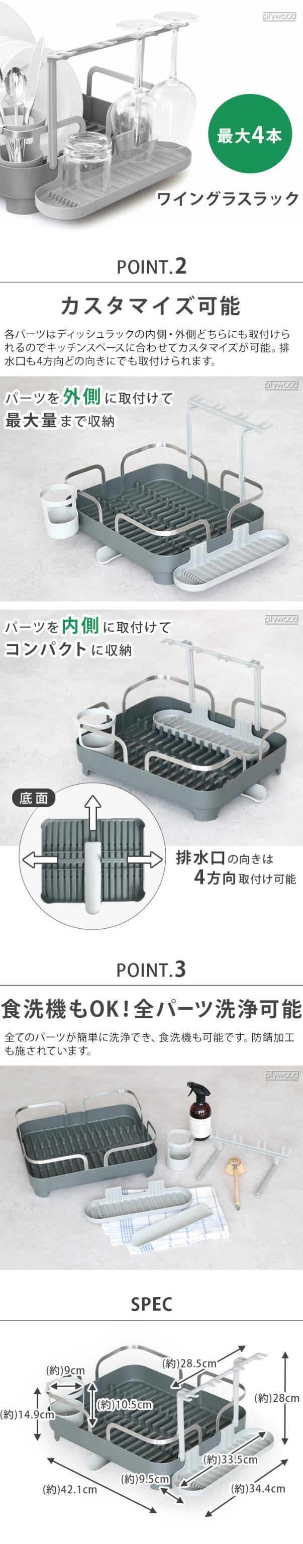 | ディッシュラック:(約)幅42.1×奥行34.4×高さ14.9cm カトラリーポケット:(約)直径9×高さ10.5cm 多目的トレイ:(約)幅9.5×奥行33.5×深さ2cm ワイングラスラック取付時:(約)幅7.5×奥行28.5×高さ28cm |