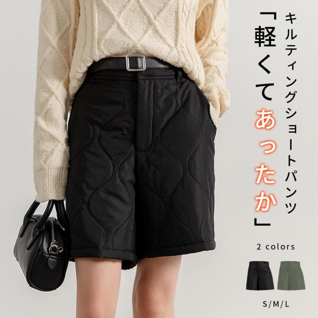 秋新作 「厚手+中綿入りで暖かさ抜群」ショートパンツ ハーフパンツ キルティング レディース きれいめ ワイド ショート丈 ズボン あったかい 暖かい 防寒 バックギャザーゴム ホック ファスナー ジップアップ ポケット ベルトループ 裏地付き 軽い 美脚 秋冬 黒