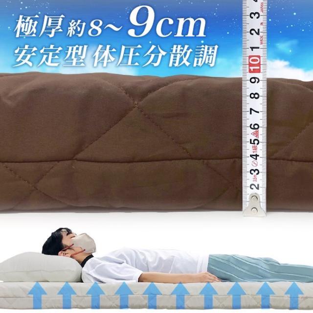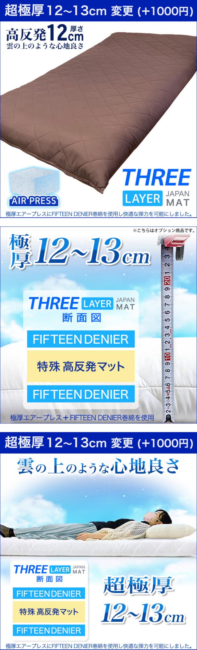 超極厚12〜13cmは極厚エアープレスにFIFTEEN DENIERの巻き綿を使用し、快適な弾力を可能にしました。