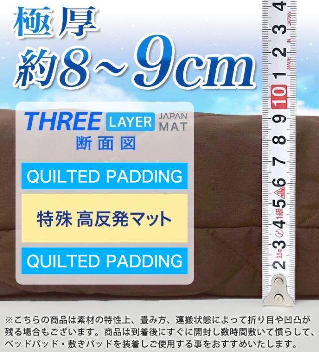 ◆極厚 超固反発加工製品のお取り扱いについて※超固反発加工(強化高反発マット)製品は、素材の特性上、畳み方・運搬状態によって折り目や凹凸が残る場合も御座います。特に極厚は厚手のマットのため折り目や凹凸が残る事が御座います。※商品到着後にすぐに開封し、数時間敷いて慣らしてからベッドパット・敷きパッドを装着しご使用する事をおすすめ致します。※折り目、凹凸はご使用には問題有りませんが気になる方はウレタンをお勧め致します。ご了承願います。