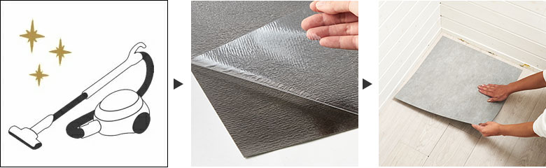 | 元の床を掃除します。 | 裏紙の台紙を剥がします。 | お部屋の端からどんどんタイルを並べていきます。 |