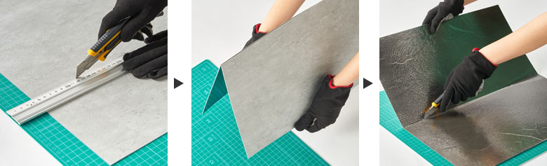 | 下書きでしるしをつけ、定規を当ててカッターで数回切り込みを入れます。 | 切り口を入れた部分を折り曲げ、パキンと折ります。 | まだつながっている場合はカッターを入れて完全に切り離します。 |