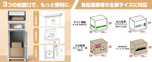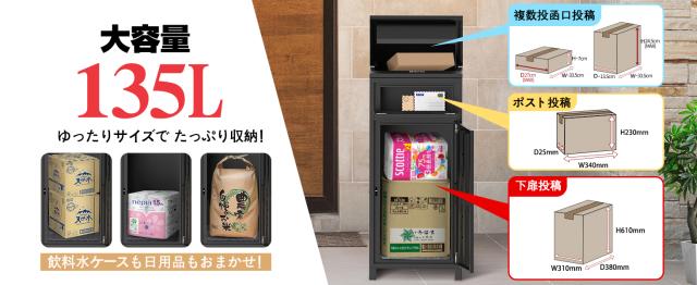 【ポスト一体型宅配ボックス&複数荷物受け取り対応】従来の宅配BOXは一度の投函しかできなかった問題を、三つの投函口デザインを採用することで解決。「上部投函口」からは複数回の投函が可能で、大型荷物は「メイン扉」から受け取れます。 また、「メールボックス」にはポスト投函口を備えており、A4サイズ以上の郵便物や雑誌、新聞紙、レターパックなども受け取ることができます。 135Lの大容量スペースは、まとめての荷物受け取りにも対応し、お米や飲み物、日用品なども楽々収納可能です。各業者の主要サイズにも対応しており、快適で効率的なご利用ができます。