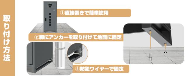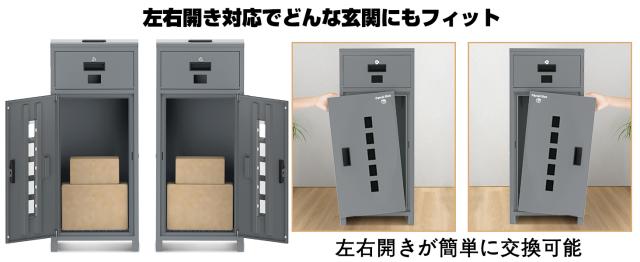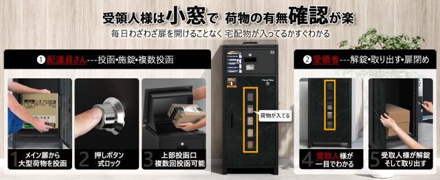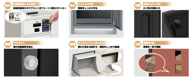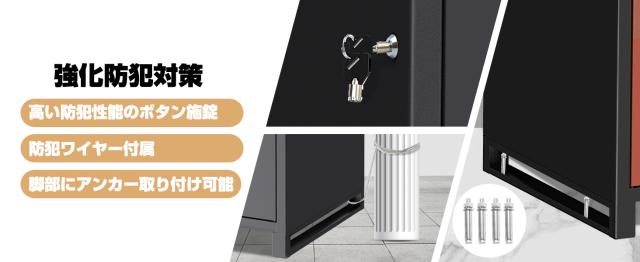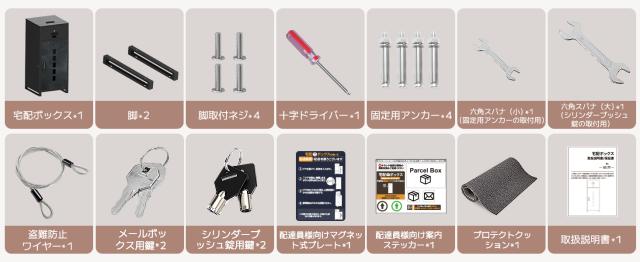 【機能&付属品の紹介】設置場所に合わせて扉の向きを自由に調整可能な「両開き扉」を採用。 扉には「小窓」を設けており、荷物や郵便物が届いているかを簡単に確認できます。 強力なマグネット付きのメイン扉で、しっかりと閉まる安心設計。 内部には二つの「印鑑収納スペース」があり、二つの印鑑ホルダーを使用することで、宅配員が簡単に受け取り確認を行えます。 付属品には、スペアキー(各×2)、アンカーボルト(×4)、設置用ワイヤー(×1)、案内用マグネット(×1)、クッションなどが含まれています。さらに、盗難や転倒防止のための部品も完備しており、安心してご使用いただけます。