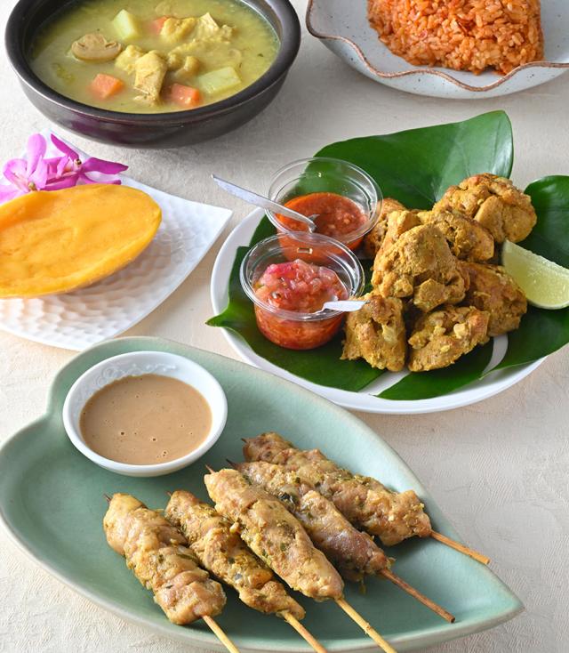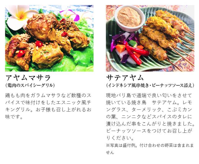 【サテアヤム(インドネシア風串焼き・ピーナッツソース添え)】鶏もも肉・玉葱・レモングラス・ニンニク・ショウガ・醤油・黒砂糖・コリアンダー・ターメリック・こぶみかんの葉・塩・唐辛子・植物油<ピーナッツソース>ピーナッツバター・ココナツミルク・ニンニク・しょうが・コリアンダー・黒砂糖・カイエンヌペッパー・塩