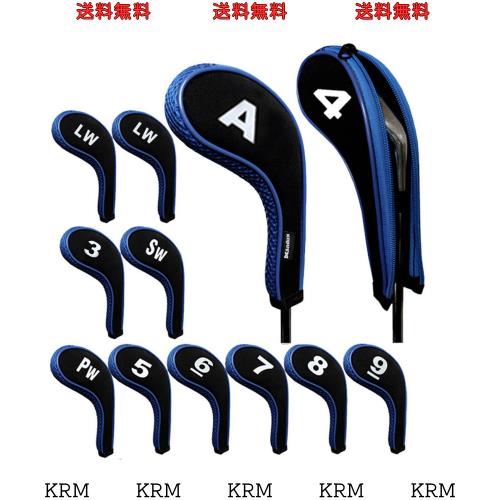 Andux 番手プリント ゴルフ アイアンカバー ファスナー付き ロングネック 12個/セット (ブラック+ブルー)