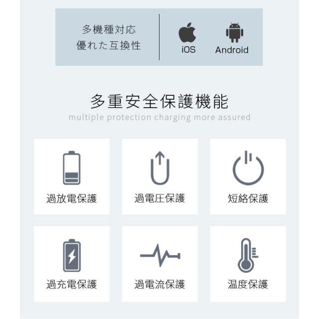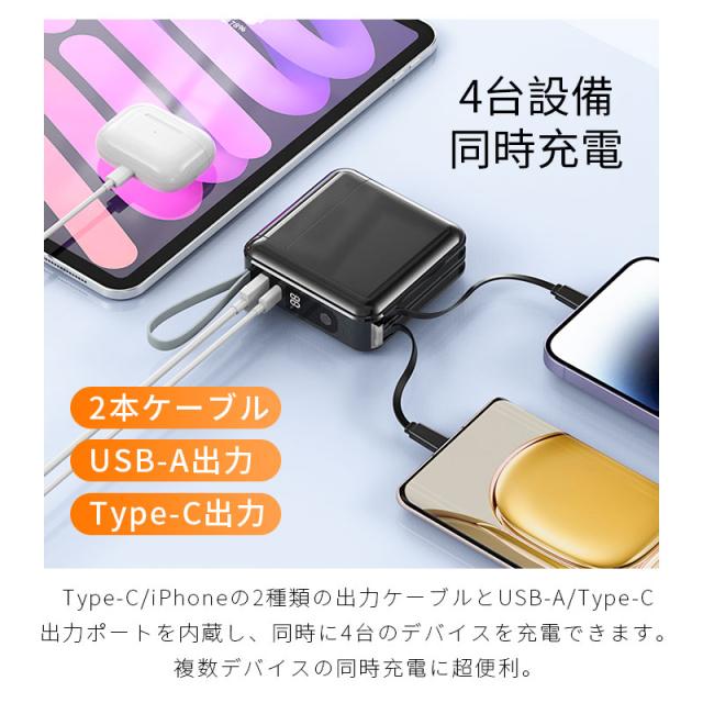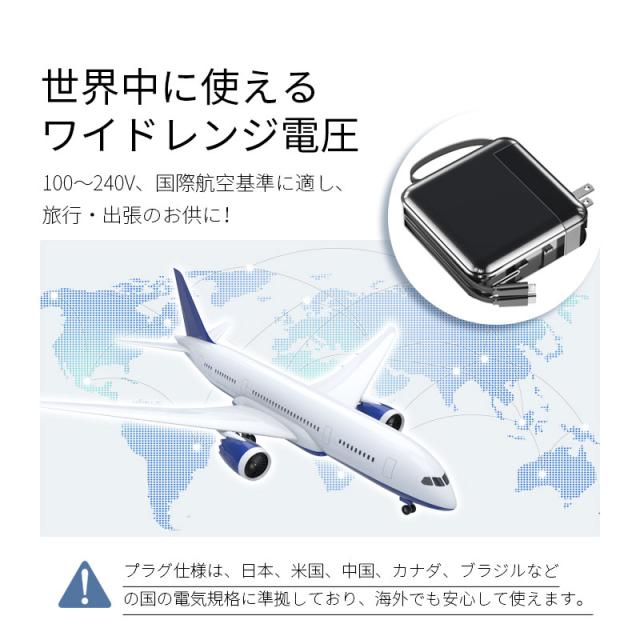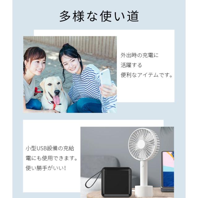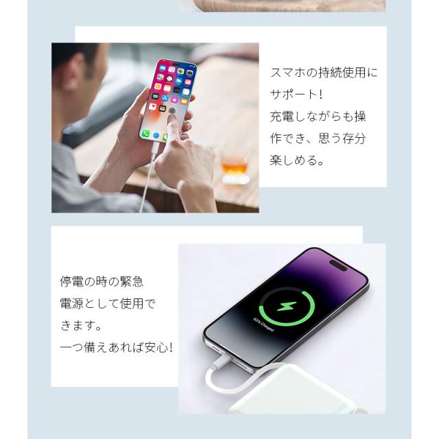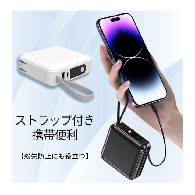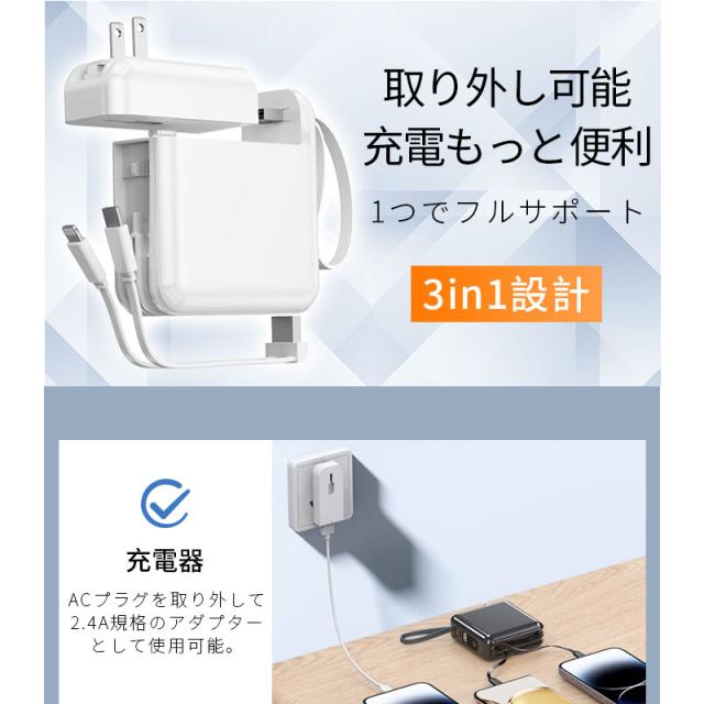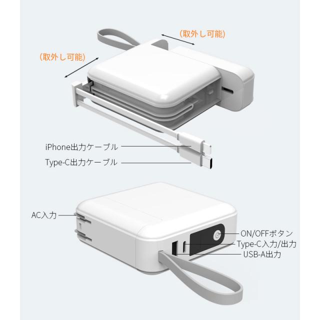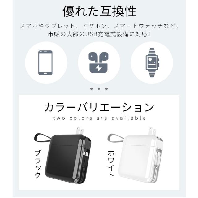 本製品はノマドワークや出張など外で仕事をする際に強い味方となるコンセントプラグ付きUSBアダプタとUSBケーブルとモバイルバッテリーが一つになった便利過ぎる3in1充電アイテムです。iPhone/Type-C出力ケーブルとUSB-A/Type-C出力ポートが付いており、スマホからノートパソコンまで、様々なUSB製品の充電をサポートします。