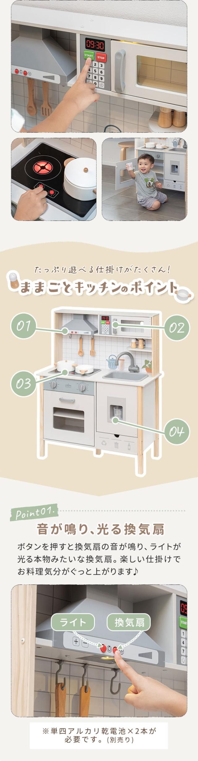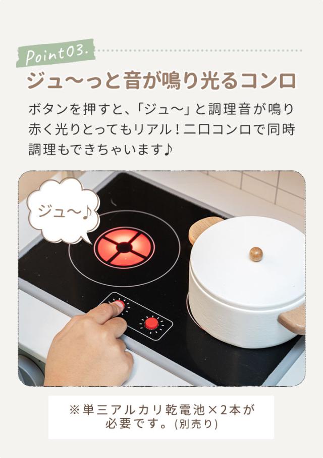 - 孫の誕生日プレゼントに購入しました。他の商品と比べて、IHや換気扇やレンジも音が鳴り電気も付くので、こちらに決めました。 購入後のアクシデントにも迅速に対応してくださり、こちらの都合も考慮していただきました。 とても感じの良いお店で購入できたこと嬉しく思います。