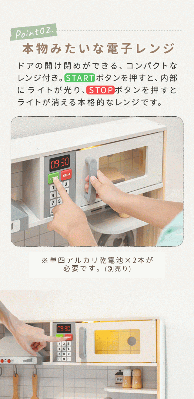 | 電源: ・換気扇…単四アルカリ乾電池×2本 ・電子レンジ…単四アルカリ乾電池×2本 ・コンロ…単三アルカリ乾電池×2本 |