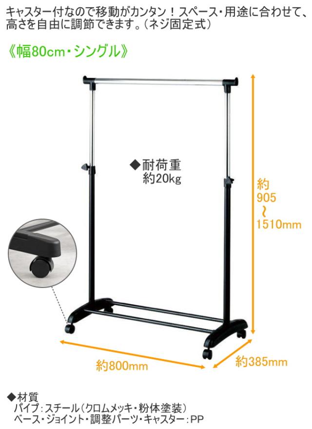 SP極太パイプハンガー シングル 幅80cm N-7597 パイプハンガー ハンガーラック 洋服掛け コートハンガー 組立式 高さ調節 幅80cm シングル インテリア 干す 収納 家具 キャスター付き シンプル パール金属