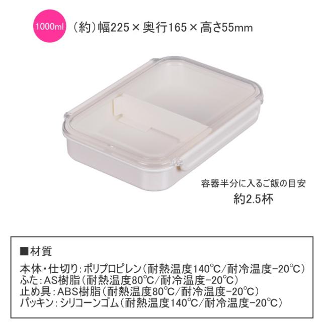 本体・仕切り:ポリプロピレン(耐熱温度140度・耐冷温度-20度) 蓋:AS樹脂(耐熱温度80度・耐冷温度-20度) 止め具:ABS樹脂(耐熱温度80度・耐冷温度-20度) パッキン:シリコーンゴム(耐熱温度140度・耐冷温度-20度) |
