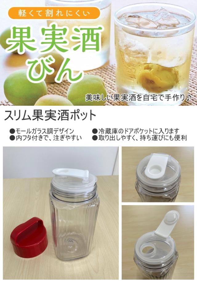 美味しい果実酒を自宅で手作り! モールガラス調デザイン。軽くて割れにくいPET樹脂製。 スリムなポットタイプは中蓋付きで注ぎやすい。 冷蔵庫のドアポケットに入ります。 取り出しやすく持ち運びにも便利です。 びんタイプはガス抜き調整弁付き。 注ぎ口の蓋が固定できそのまま注げます。 |
