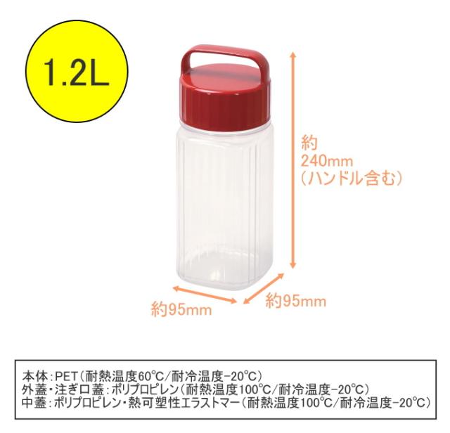 本体:PET(耐熱温度60℃ / 耐冷温度-20℃) 外蓋・注ぎ口:ポリプロピレン(耐熱温度100℃ / 耐冷温度-20℃) 中蓋:ポリプロピレン・熱可塑性エラストマー(耐熱温度100℃ / 耐冷温度-20℃) |