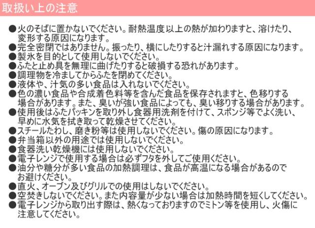 本体・中容器:ポリプロピレン(耐熱温度140度・耐冷温度-20度) 蓋:AS樹脂(耐熱温度80度・耐冷温度-20度) バックル:ABS樹脂(耐熱温度80度・耐冷温度-20度) パッキン・吸気弁:シリコーンゴム(耐熱温度140度・耐冷温度-20度) |