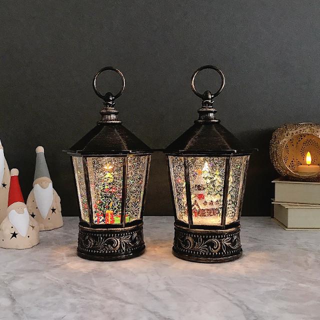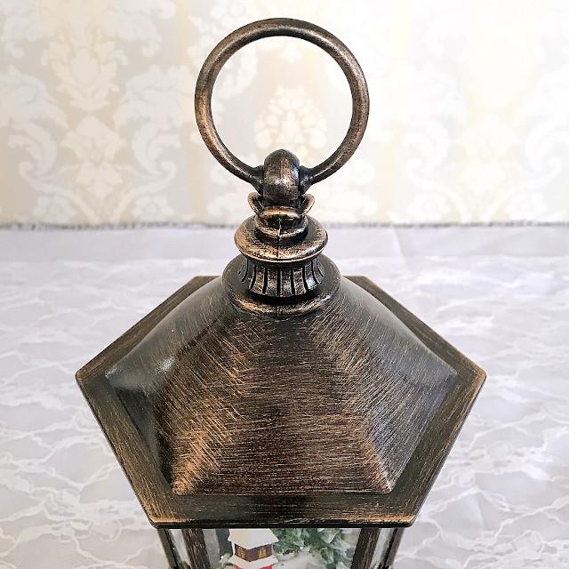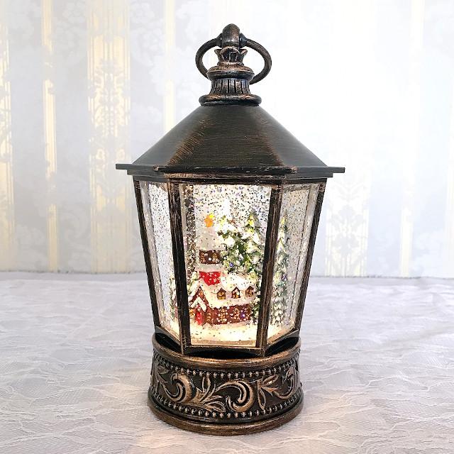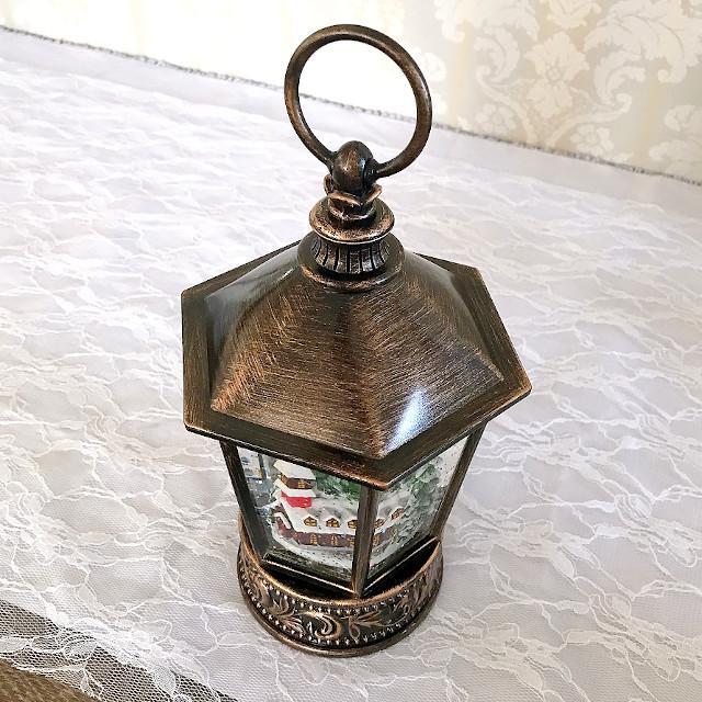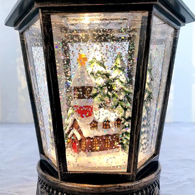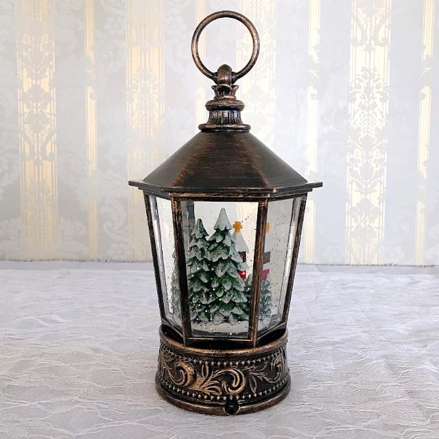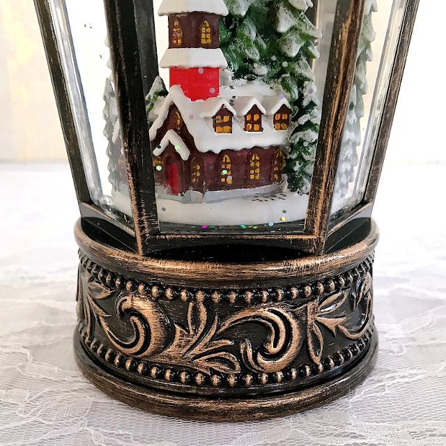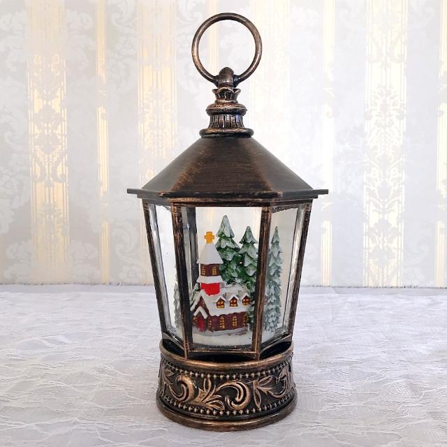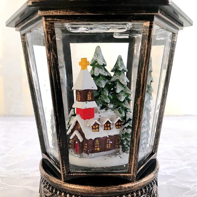 アンティーク風のクラシカルなランタンに、森にたたずむ教会が入った高級感のあるクリスマスオブジェ。