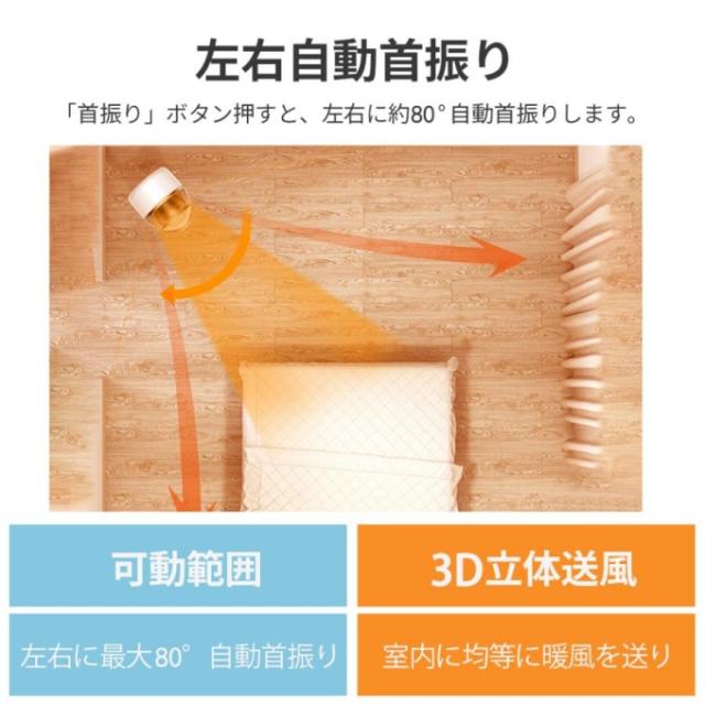 80度左右自動首振り機能が付いているので、本体を移動させなくても広範囲をしっかり暖めてくれます。