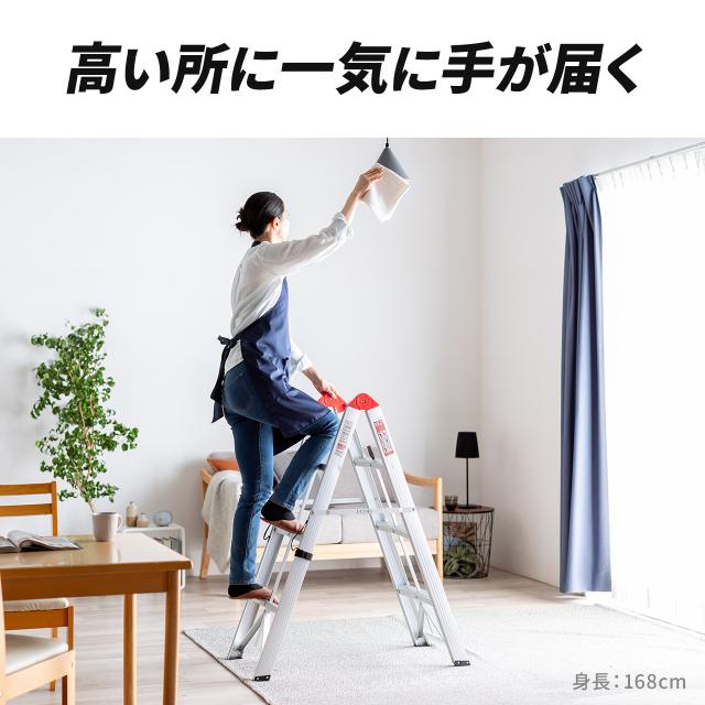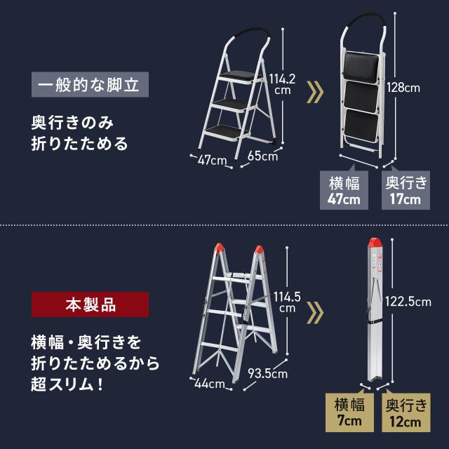 ⇒ご購入の前にご確認下さい高いところに手が届き簡単に設置できるコンパクトでスリムな脚立。さっと広げてすぐに使用可能。丈夫で軽いアルミフレーム製。折りたたんだ後、持ち運びに便利な取っ手が付き。高いところにも手が届く三段式脚立。耐荷重150kgの頑丈設計。【WEB限定商品】