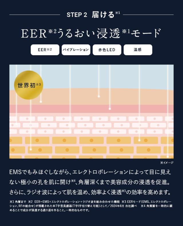 *1EERモード(EMS、エレクトロポレーション、RFの組合せ)が搭載された本T字型美顔器(T字I字切り替え可能)として/2024年8月 自社調べ
