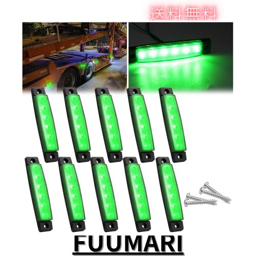 【商品詳細】LED サイドマーカーランプ×10 スペーサー×10 ネジ×20 材質:プラスチックボディー+6個LEDチップ カラーラインナップ:白/赤/黄/青/緑の5種類。 【高輝度LED採用】6個の高輝度LEDを採用。夜間はソフトなグリーン光を発する 意外性が際立つドレスアップアイテム。 【5色のカラーバリエーション】5色のカラー設定によりボディカラーに合わせたコーディネートが可能で、個性を引き出します。 【取付方法も簡単】取り付けは、二つネジ経M6で固定する簡単な構造となります。マーカーランプ本体を交換するだけです。 【12V 24V 適合車種】トラックはもちろん、トレーラー、ローリー、バス、軽トラなどそれ以外の車両でも、車両サイドビューの高級感を演出します。
