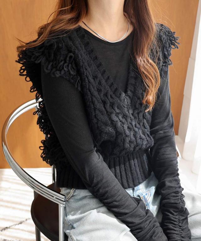 Vネック フリンジ ニット ベスト