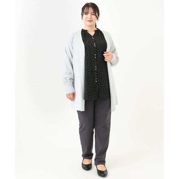 ゆったり落ち感のきれいな合繊ブラウスは、襟ぐりのタックとスリットで首回りもスッキリきれいに見せます。