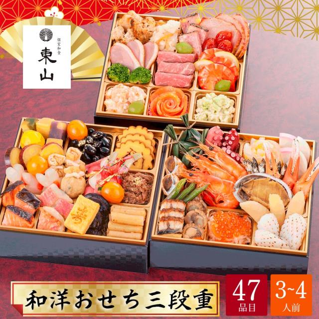 おせち 料理 予約 お節 2026 個室和食 東山 新宿本店 和洋おせち 三段重 3〜4人前 47品目 東山-20 送料無料 【着不可地域:北海道・沖縄・離島】【12月31日着】【時間指定不可】