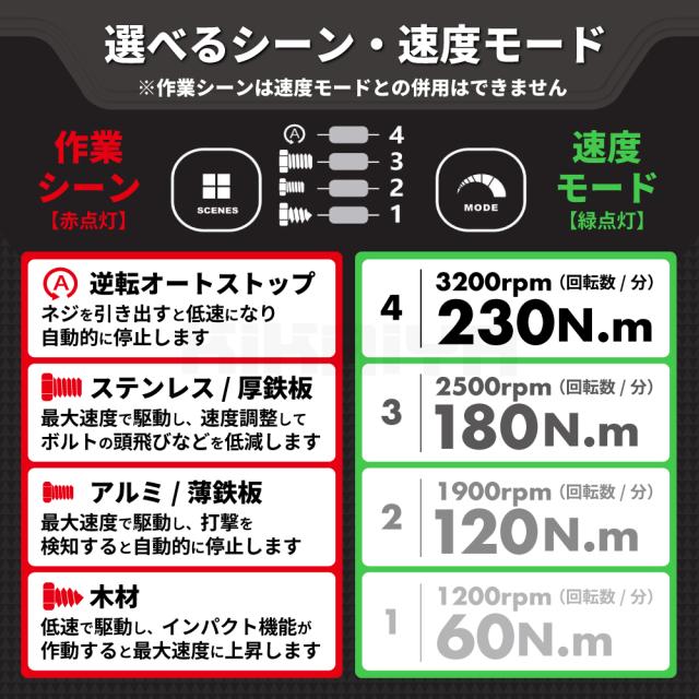| 無負荷回転数 毎分打撃数 トルク範囲 | モード(4)/ 0〜3200rpm / 0〜4000BPM / 230Nm モード(3)/ 0〜2500rpm / 0〜3500BPM / 180Nm モード(2)/ 0〜1900rpm / 0〜1800BPM / 120Nm モード(1)/ 0〜1200rpm / 0〜1400BPM / 60Nm |