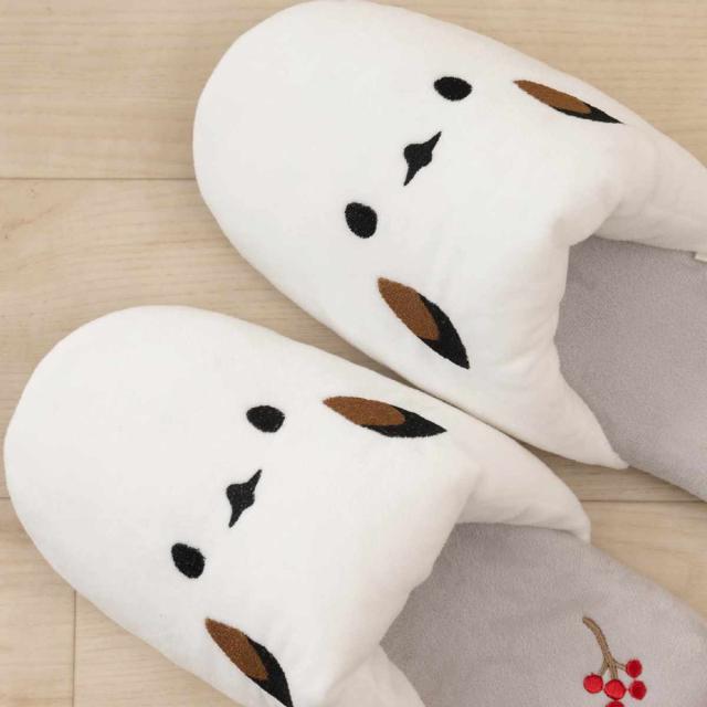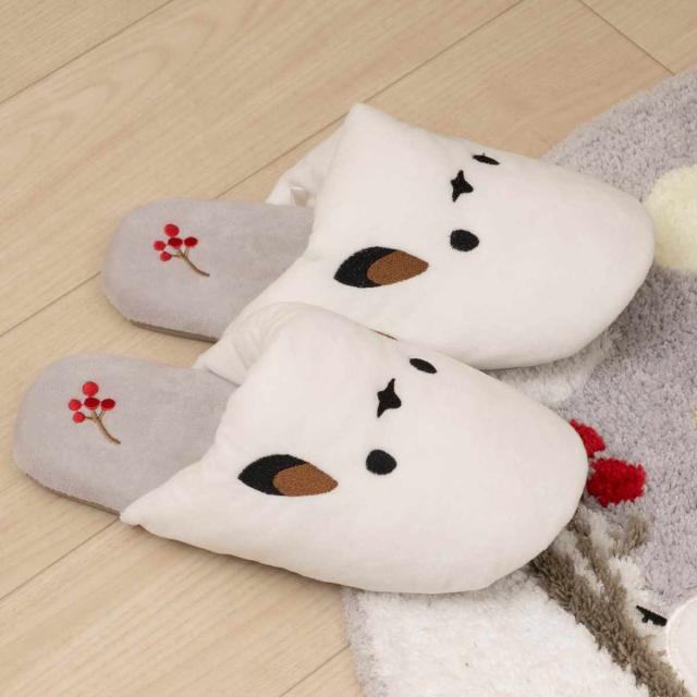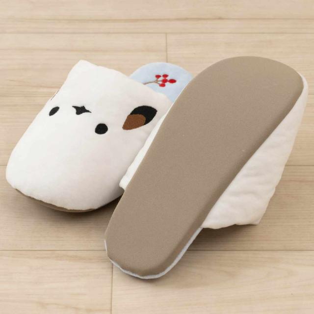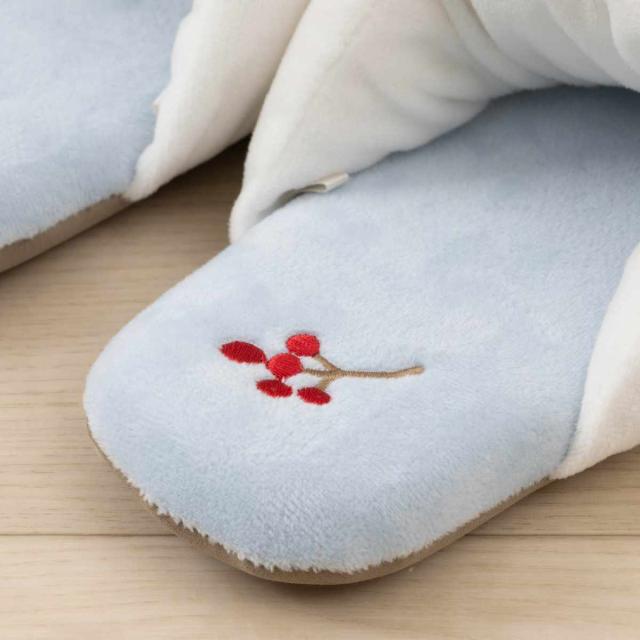 スリッパの甲部分はマシュマロのようにふわっともちっとした仕様で、ふんわり足元が包み込まれるような履き心地です。かかと部分にはワンポイントの赤い実の刺繍が入っています。