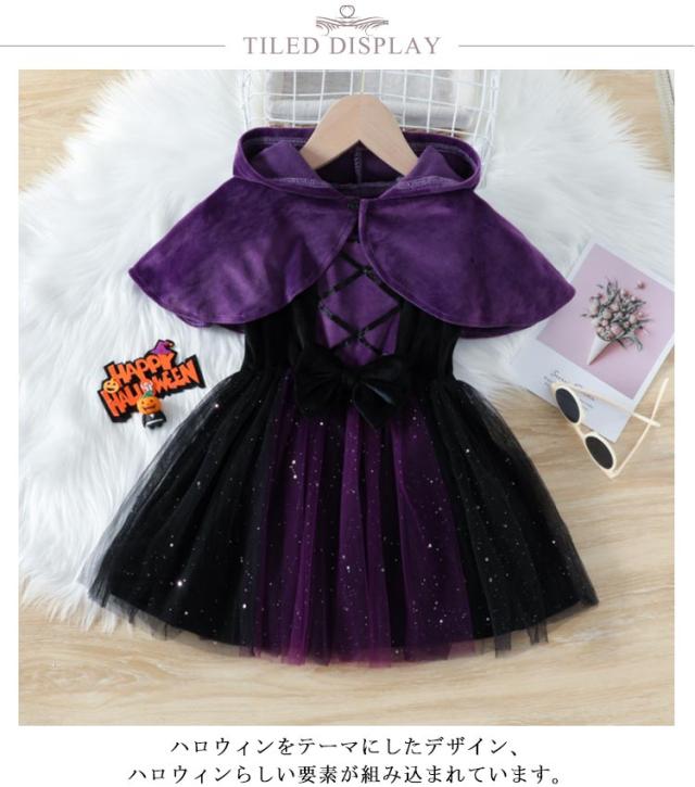 魔女 ハロウィン 子供 秋冬 マント 魔女 ハロウィン 長袖 フード付き キラキラ チュール ワンピース パープル 衣装 魔法使い 小学生 コスチューム ウイッチ 子供 女の子 2点セット パーティー ドレス 演劇 学院祭 文化祭 可愛い cosplay