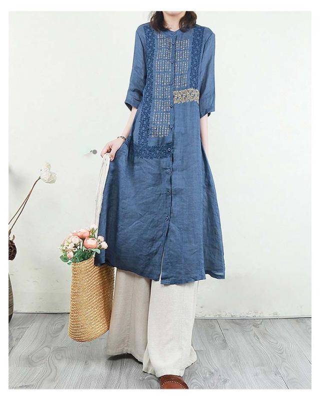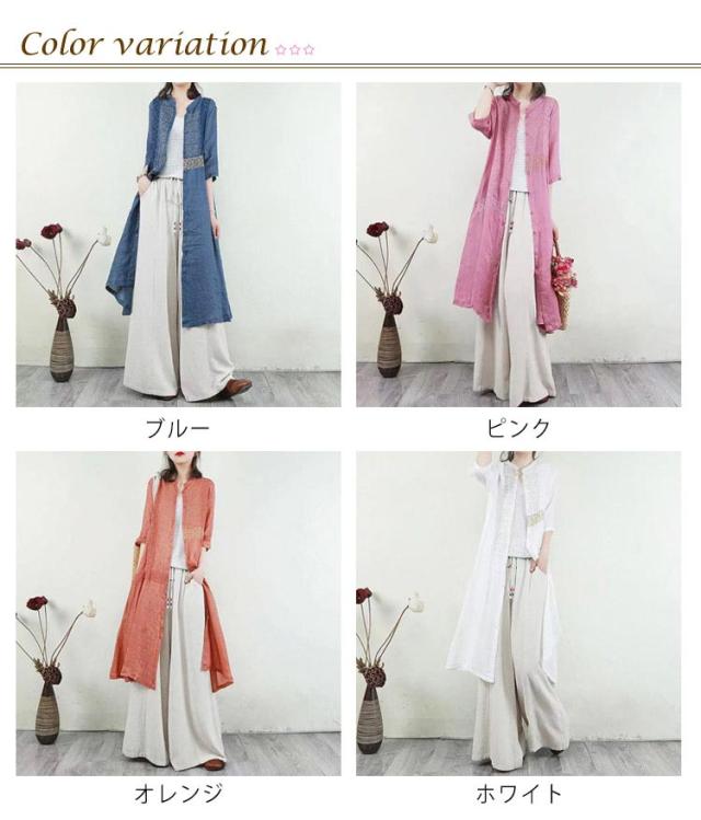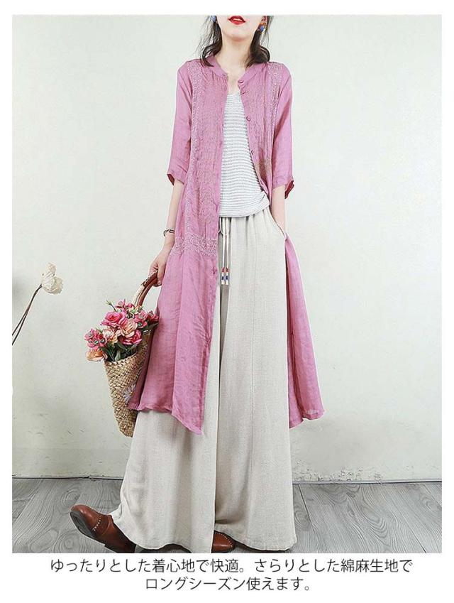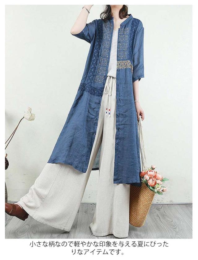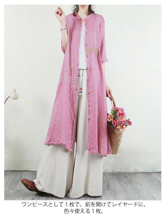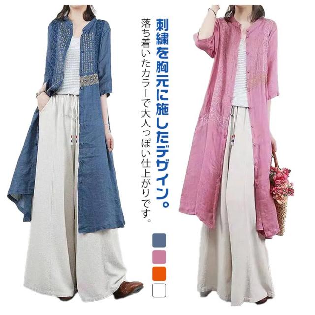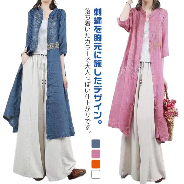 羽織り 刺繍シャツワンピース カーディガン シャツワンピース ワンピース 長袖 刺繍シャツワンピース ロング丈 シアー ロングシャツワンピース 襟付き 5分袖 夏 チュニック ロング ワンピース レディース コットンリネン 体型カバー 紫外線対策