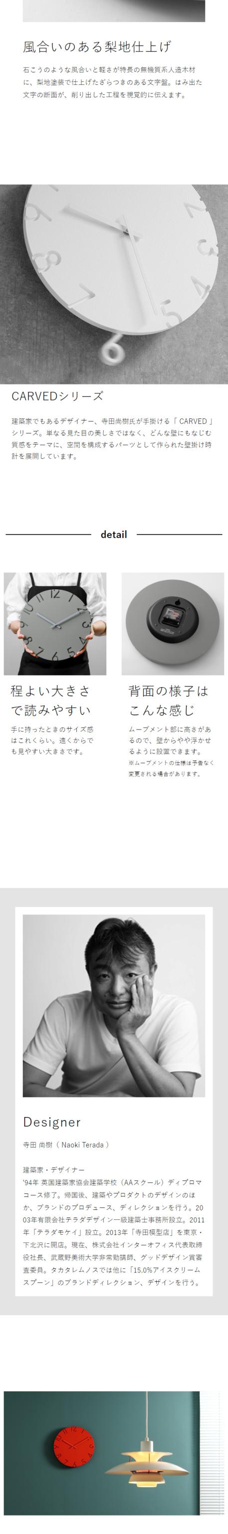 建築家の寺田尚樹氏が手がけるカーヴドシリーズ直径30.5cmの時計。彫り込まれた数字のインデックスに豊富なカラー展開、秒針がなく静かなのでリビングやダイニング、寝室にもおすすめ。