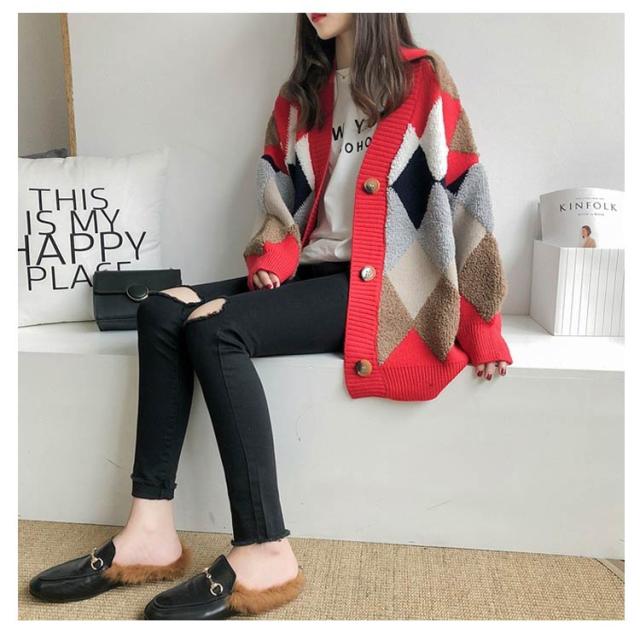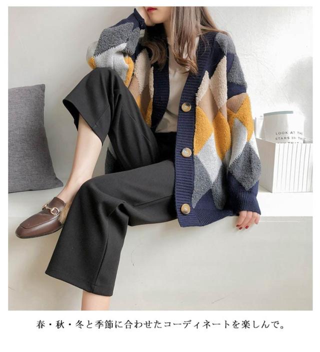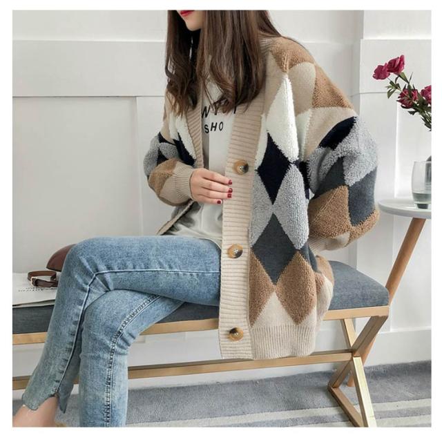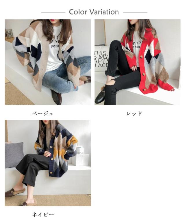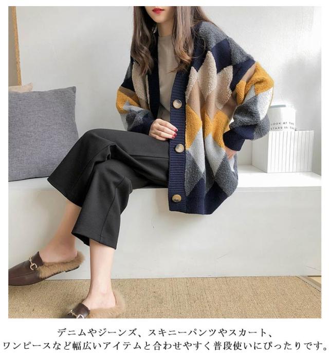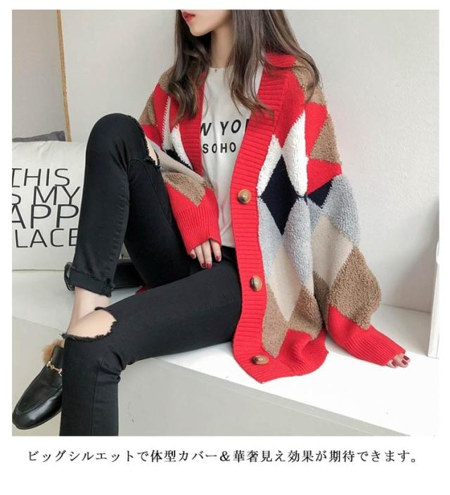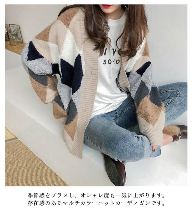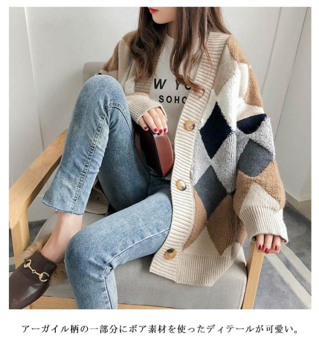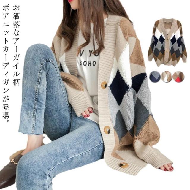 レディース 冬 アウター ボア モコモコ ゆったり アーガイル柄 あったか ニット セーター Vネック ドロップショルダー 春 ニットカーディガン 前開き 長袖 韓国風 暖かい 大きいサイズ ニットカーディガン オーバーサイズ 秋 秋物 マルチカラー オフィス 通勤 通学