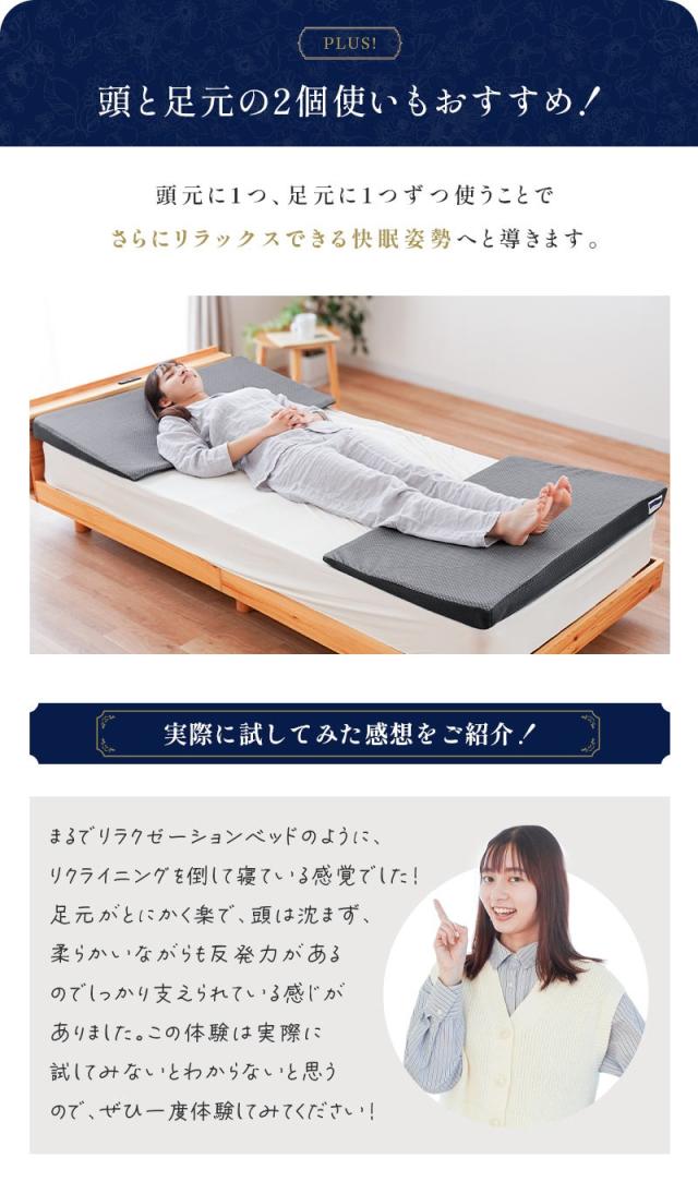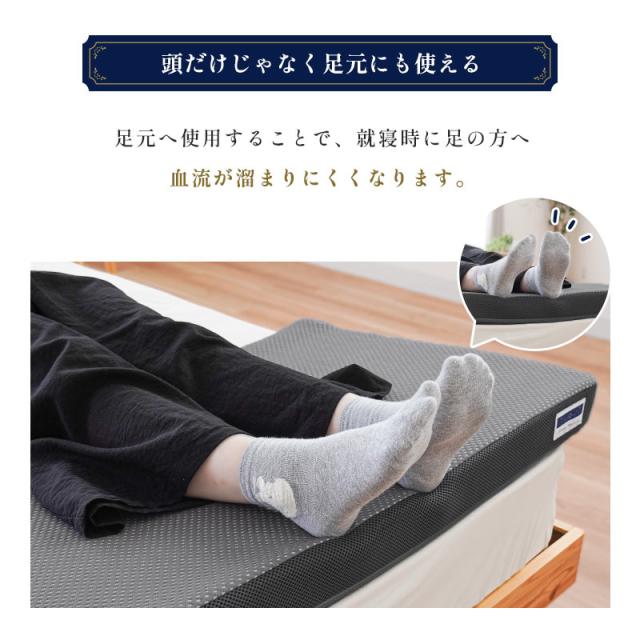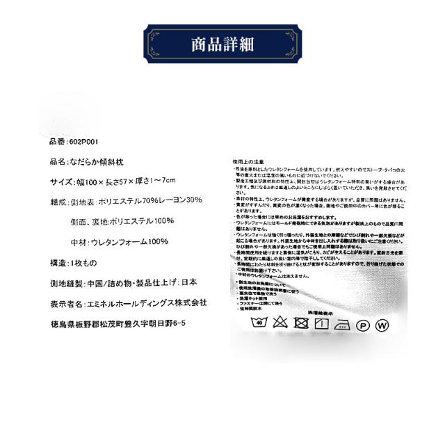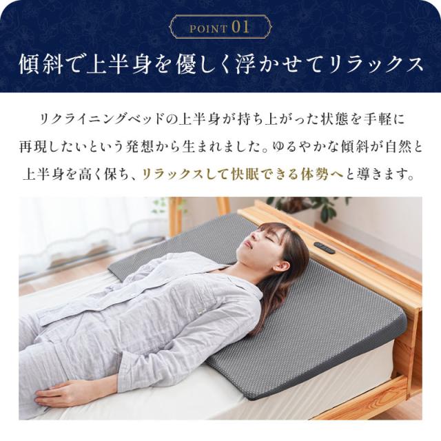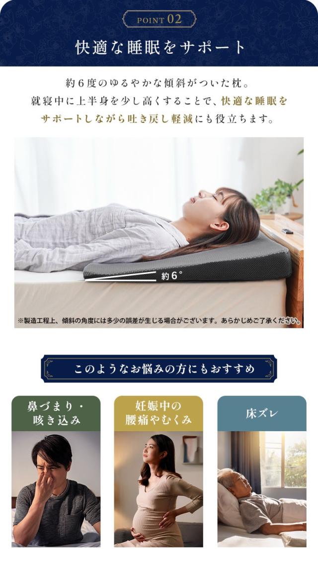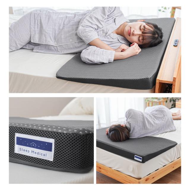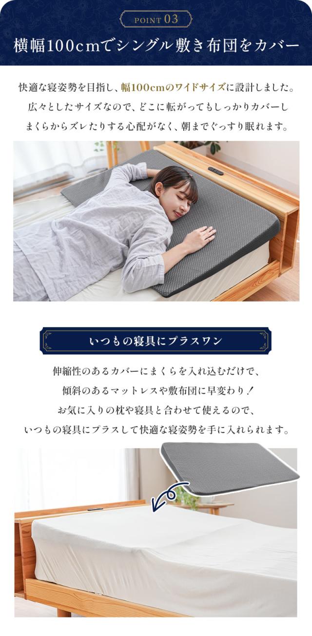 | ・健康は、眠りから。 当社のオリジナルブランド Sleep Medicalは、健康で素敵な毎日を眠りで サポートすることを目指します。 あなたの明日が、元気で、健やかで ありますように。 ・傾斜で上半身を優しく浮かせてリラックスリクライニングベッドの上半身が持ち上がった状態を手軽に再現したいという発想から生まれました。ゆるやかな傾斜が自然と上半身を高く保ち、リラックスして快眠できる体勢へと導きます。 ・快適な睡眠をサポート約6度のゆるやかな傾斜がついた枕。就寝中に上半身を少し高くすることで、快適な睡眠をサポートしながら吐き戻し軽減にも役立ちます。 ・横幅100cmでシングル敷き布団をカバー快適な寝姿勢を目指し、幅100cmのワイドサイズに設計しました。広々としたサイズなので、どこに転がってもしっかりカバーし、まくらからズレたりする心配がなく、朝までぐっすり眠れます。 ・ニット生地の柔らかな寝心地表面は中綿入りのニット生地のため、柔らかな触り心地。裏面、側面には通気性の良いメッシュ生地を使用しています。 ・お手入れ簡単・洗える側生地L字に開けるファスナーで、着脱の手間を軽減。取り出ししやすくなっています。 ・国内自社工場で製造自社工場で製造しています。国内の工場で作られているため安心して、お使いいただけます。 | |