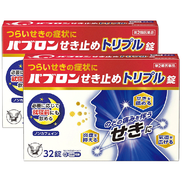 ◆パブロンせき止めトリプル錠は、鎮咳、気管支拡張、抗炎症の3つの作用でのどの痛みを伴うせきに効果をあらわすせき止め薬です。