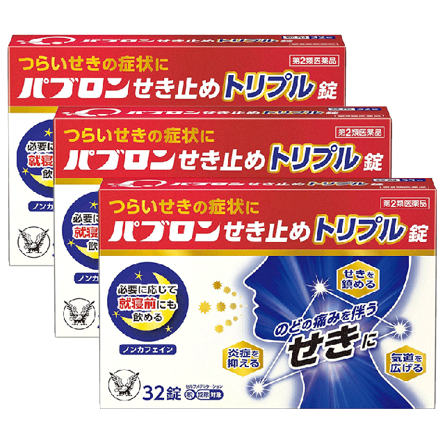 ◆パブロンせき止めトリプル錠は、鎮咳、気管支拡張、抗炎症の3つの作用でのどの痛みを伴うせきに効果をあらわすせき止め薬です。