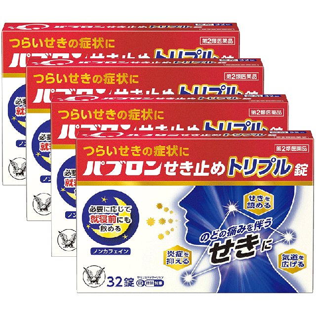 ◆パブロンせき止めトリプル錠は、鎮咳、気管支拡張、抗炎症の3つの作用でのどの痛みを伴うせきに効果をあらわすせき止め薬です。