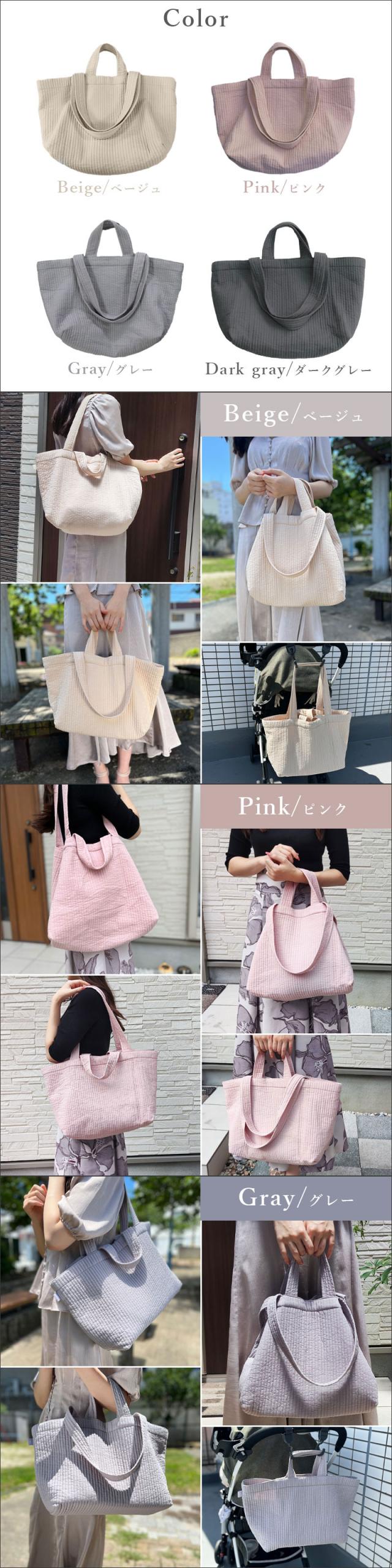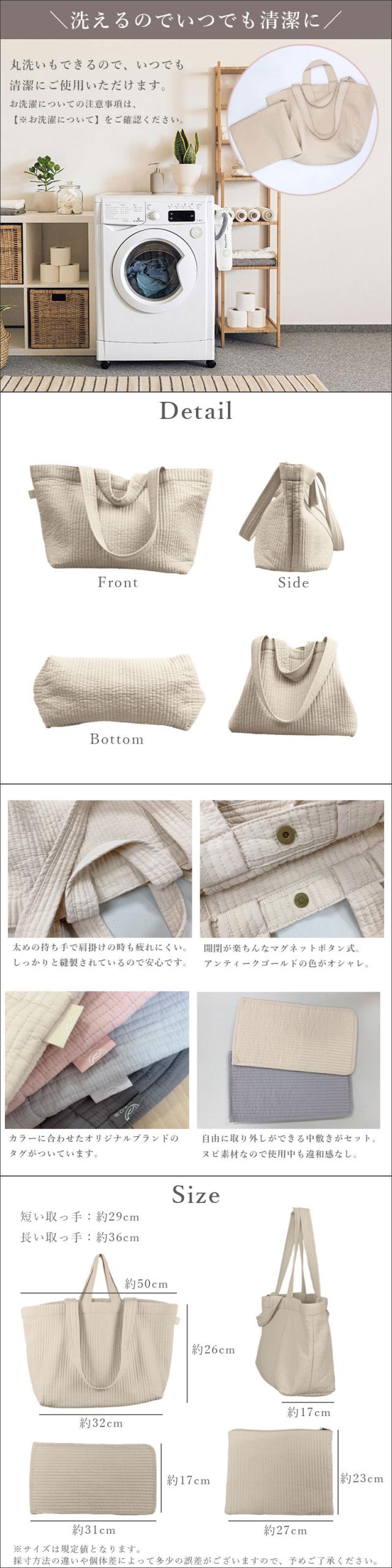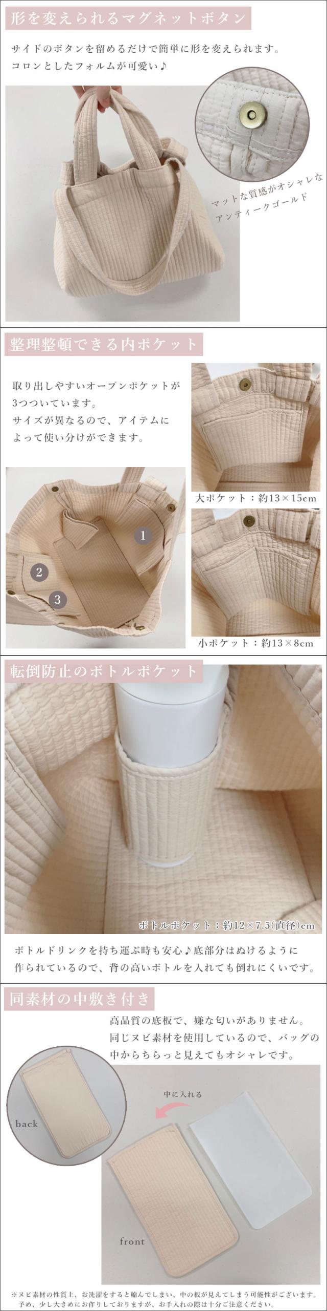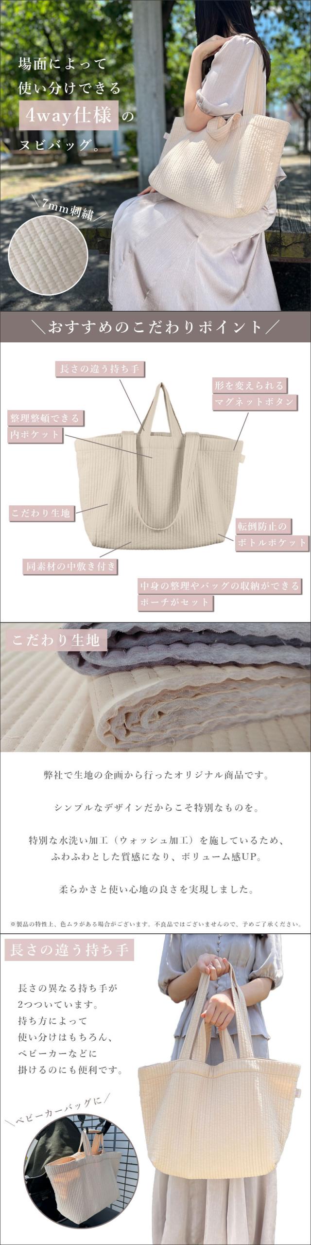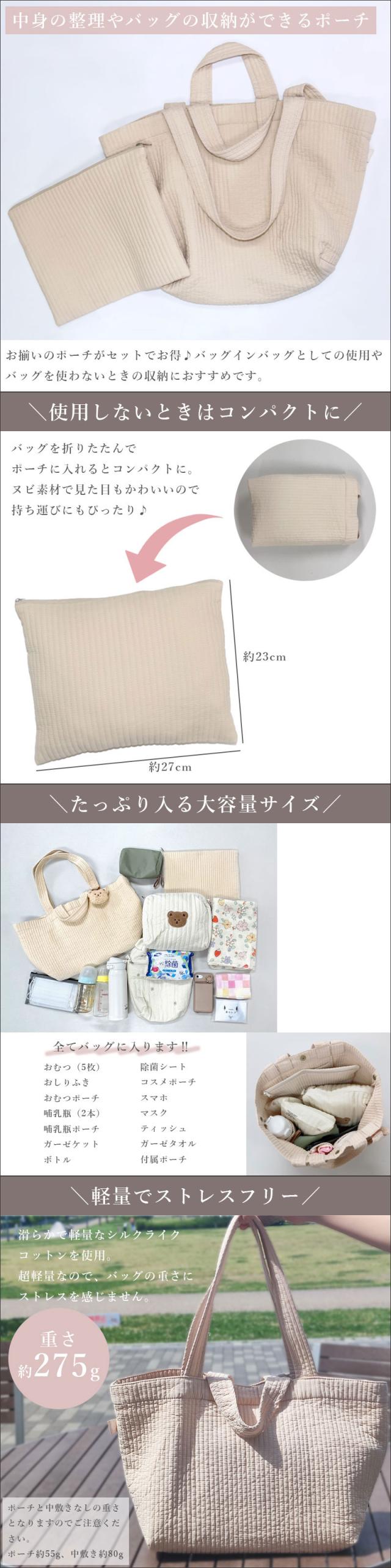 | 商品 特徴 | 【こだわり生地】 弊社で商品の企画から行ったオリジナル商品です。 シンプルなデザインだからこそ特別なものを。 特別な水洗い加工(ウォッシュ加工)を施しているため、ふわふわとした質感になり、ボリューム感UP。 柔らかさと使い心地の良さを実現しました。 【長さの違う持ち手】 長さの異なる持ち手が2つついています。 持ち方によって使い分けはもちろん、ベビーカーなどに掛けるのにも便利です。 【形を変えられるマグネットボタン】 サイドのボタンを留めるだけで簡単に形を変えられます。 コロンとしたフォルムが可愛い♪ 【整理整頓できる内ポケット】 取り出しやすいオープンポケットが3つついています。 サイズが異なるので、アイテムによって使い分けができます。 【転倒防止のボトルポケット】 ボトルドリンクを持ち運ぶ時も安心♪ 底部分はぬけるように作られているので、背の高いボトルを入れても倒れにくいです。 【同素材の中敷き付き】 高品質の底板で、嫌な匂いがありません。 同じヌビ素材を使用しているので、バッグの中からちらっと見えてもオシャレです。 【中身の整理やバッグの収納ができるポーチ付き】 お揃いのポーチがセットでお得♪ バッグインバッグとしての仕様やバッグを使わないときの収納におすすめです。 【使用しないときはコンパクトに】 バッグを折りたたんでポーチに入れるとコンパクトに。 ヌビ素材で見た目もかわいいので、持ち運びにぴったり♪ 【たっぷり入る大容量サイズ】 お子様とのお出かけで荷物が多いママさんも安心の大容量サイズ。 A4サイズやノートパソコンも入るサイズ感なので、通勤用にもおすすめです。 【軽量でストレスフリー】 滑らかで軽量なシルクライクコットンを使用。 超軽量なので、バッグの重さにストレスを感じません。 【洗えるのでいつでも清潔に】 丸洗いもできるので、いつでも清潔にご使用いただけます。 【細部にもこだわりを】 ・持ち手部分は太めのお作りなので、肩掛けの際も疲れにくい。しっかりと縫製されているので安心です。 ・開閉が楽ちんなマグネットボタン式。アンティークゴールドの色もオシャレです。 ・カラーに合わせたオリジナルブランドのタグがついています。 |