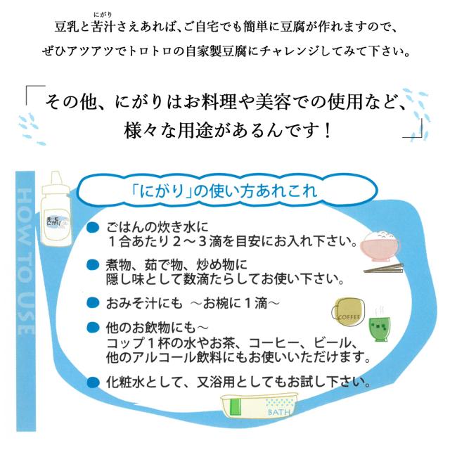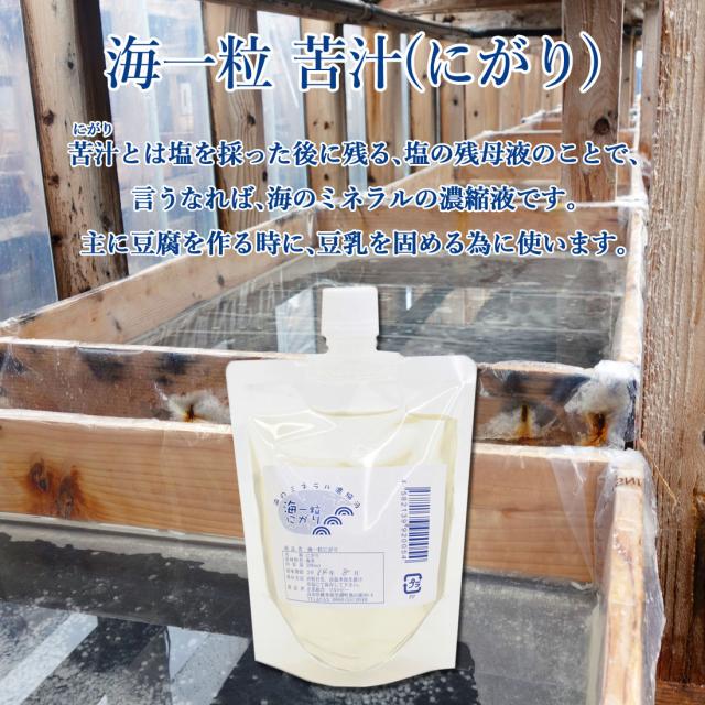 にがりとは塩を採った後に残る、塩の残母液のことで、言うなれば海のミネラルの濃縮液です。