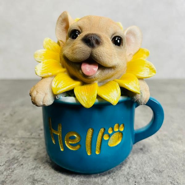 かわいい 犬 置物 カップに入るフレンチ・ブルドッグ 動物 おしゃれ 玄関 贈り物 可愛い インテリア ガーデンオーナメント 卓上