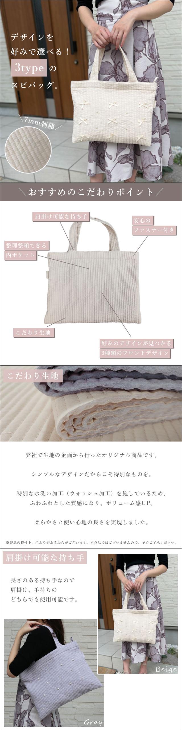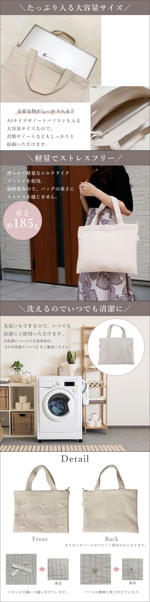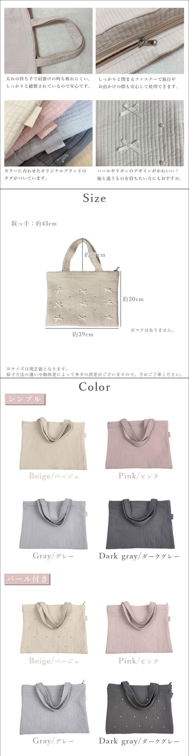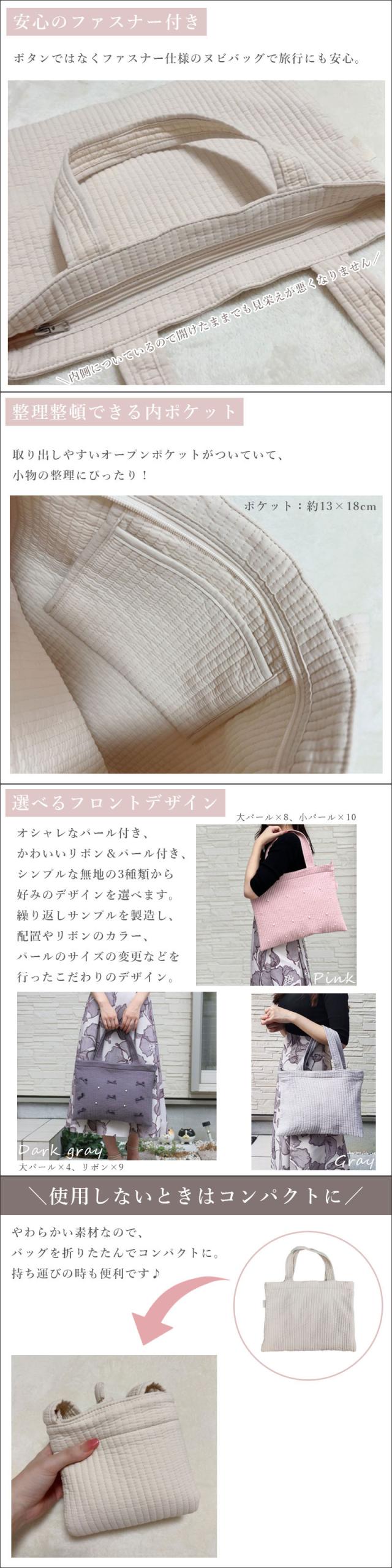 | 商品 特徴 | 【こだわり生地】 弊社で商品の企画から行ったオリジナル商品です。 シンプルなデザインだからこそ特別なものを。 特別な水洗い加工(ウォッシュ加工)を施しているため、ふわふわとした質感になり、ボリューム感UP。 柔らかさと使い心地の良さを実現しました。 【肩掛け可能な持ち手】 長さのある持ち手なので、肩掛け、手持ちのどちらでも使用可能です。 【安心のファスナー付き】 ボタンではなくファスナー仕様のヌビバッグで旅行にも安心。 内側についているので、開けたままでも見栄えが悪くなりません。 【整理整頓できる内ポケット】 取り出しやすいオープンポケットがついていて、小物の整理にぴったり! 【選べるフロントデザイン】 オシャレなパール付き、かわいいリボン&パール付き、シンプルな無地の3種類から好みのデザインを選べます。 繰り返しサンプルを製造し、配置やリボンのカラー、パールのサイズの変更などを行ったこだわりのデザイン。 【同素材の中敷き付き】 高品質の底板で、嫌な匂いがありません。 同じヌビ素材を使用しているので、バッグの中からちらっと見えてもオシャレです。 【中身の整理やバッグの収納ができるポーチ付き】 お揃いのポーチがセットでお得♪ バッグインバッグとしての仕様やバッグを使わないときの収納におすすめです。 【使用しないときはコンパクトに】 やわらかい素材なので、バッグを折りたたんでコンパクトに。 持ち運びの時も便利です♪ 【たっぷり入る大容量サイズ】 A4サイズやノートパソコンも入る大容量サイズなので、書類やノートなどもしっかりと収納いただけます。 【軽量でストレスフリー】 滑らかで軽量なシルクライクコットンを使用。 超軽量なので、バッグの重さにストレスを感じません。 【洗えるのでいつでも清潔に】 丸洗いもできるので、いつでも清潔にご使用いただけます。 【細部にもこだわりを】 ・持ち手部分は太めのお作りなので、肩掛けの際も疲れにくい。しっかりと縫製されているので安心です。 ・しっかりと閉まるファスナーで旅行やお出かけの際も安心して使用できます。 ・カラーに合わせたオリジナルブランドのタグがついています。 |