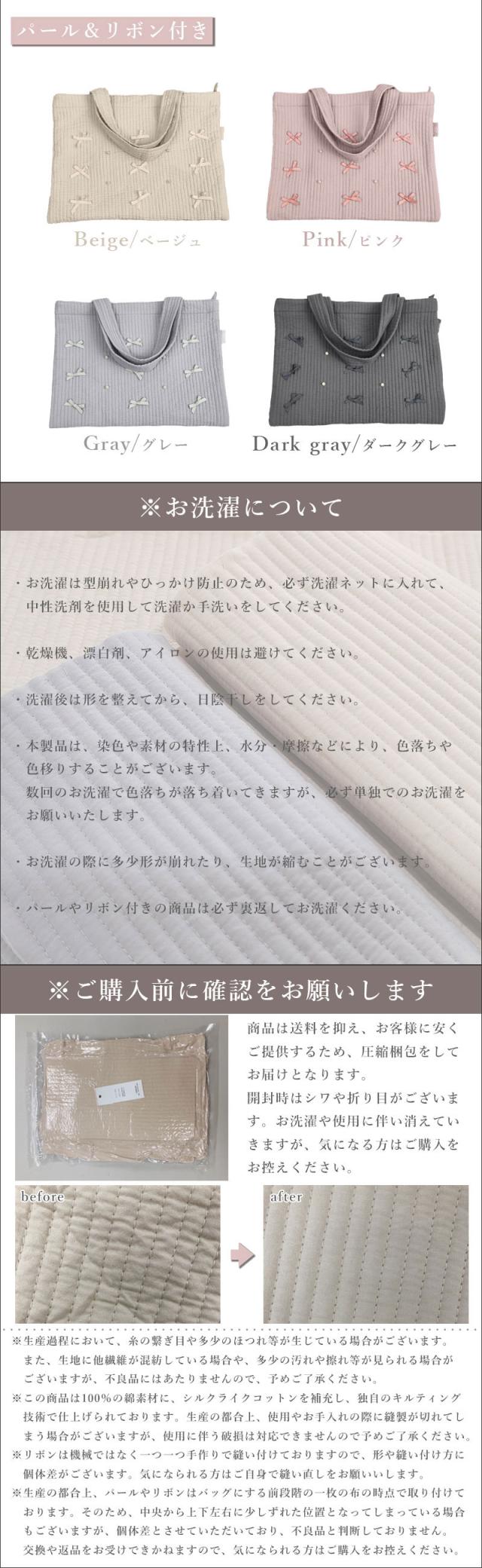 | 注意 事項 | ※生産過程において、糸の繋ぎ目や多少のほつれ等が生じている場合がございます。また、生地に他繊維が混紡している場合や、多少の汚れや擦れ等が見られる可能性がございますが、不良品にはあたりませんので、予めご了承ください。 ※この商品は100%の綿素材に、シルクライクコットンを補充し、独自のキルティング技術で仕上げられております。生産の都合上、使用やお手入れの際に縫製が切れてしまう場合がございますが、使用に伴う破損は対応できませんので、予めご了承ください。 ※リボンは機械ではなく一つ一つ手作りで縫い付けておりますので、形や縫い付け方に 個体差がございます。気になられる方はご自身で縫い直しをお願いいします。 ※生産の都合上、パールやリボンはバッグにする前段階の 一枚の布の時点で取り付けております。そのため、中央から上下左右に少しずれた位置となってしまっている場合がございますが、 個体差とさせていただいており、不良品と判断しておりません。 ※生産ロッドの違いにより細部のデザインが多少異なる場合がございます。予めご了承くださいませ。 ※画像はイメージです。実物と多少異なる場合がございます。予めご了承くださいませ。 ※太陽光の下で撮影を行っておりますので、実物より明るく感じる場合がございます。Color画像が一番実物と近いカラーなっておりますので、ご参考ください。 ※ご使用のモニター環境によって色合いが異なって感じる場合がございます。 |