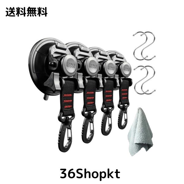 【強力真空吸盤フックセット】セット内容:吸盤フック4個、S字フック4個、タオル1枚。360度回転しロック式の自由度の高いフックです。使用前に付属のタオルでガラスを拭くことができます。車のサイドテントやサンシェードの固定に使う場合は取付穴の種類によってS字フックを選択することができます。吸盤素材:PVC+ABS・サイズ:直径9cm*厚さ4cm・耐荷重:静止状態で30kg